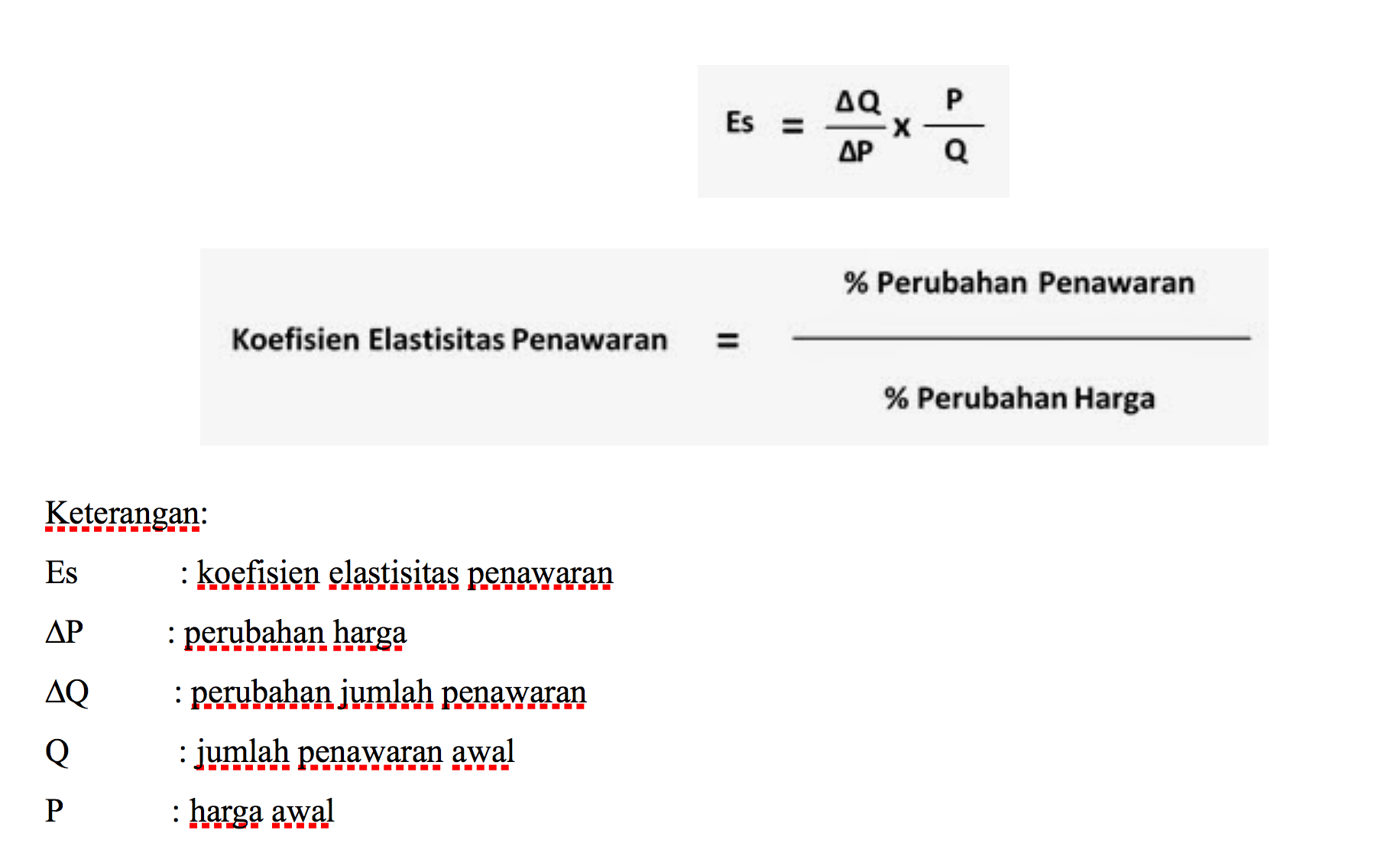 Koefisien Elastisitas Penawaran. Rumus persamaan koefisien elastisitas penawaran. Keelastisan dari penawaran dinyatakan dengan suatu bilangan yang disebut dengan koefisien elastisitas . Yang dimaksud dengan koefisien elastisitas penawaran ini yaitu angka atau presentase perbandingan tepatnya antara perubahan harga barang . 2 rumus menghitung elastisitas penawaran. Seperti telah disinggung dibagian awal, dalam kasus yang sederhana, fungsi permintaan dapat ditulis .